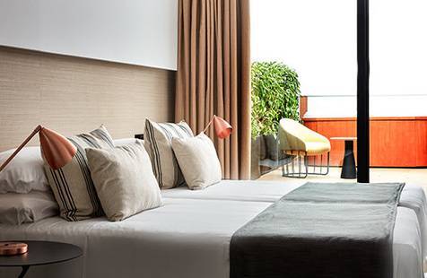 Ideally located on the chic shopping precinct of Jaime III Avenue, the Nacar building has been managed by Ramis’ family for three generations, and has undergone a renaissance with each generational change. The latest incarnation pays tribute to the spirit of the original Pension Nacar, while embodying the zeitgeist of modern day Palma. Together with acclaimed architect Magi Margués and designer Marga Rotger, Ramis has created a bold new lifestyle boutique hotel that blends sophisticated design with local flavor. Locally sourced oak and stone contrasts with industrial tones of black-lacquered iron and glass in the light and airy public spaces, while the aesthetics of the rooms and suites are defined by earth-tone fabrics and a neutral color palette. Thoughtfully designed with the modern traveler in mind, guestrooms have been outfitted with state of the art media systems including screen-mirroring AppleTV, which are Netflix and Spotify enabled, Nespresso machines, and spacious bathrooms with luxurious Molton Brown amenities. While in-room Jacuzzis and private terraces lend the Deluxe Rooms more than a little romance.