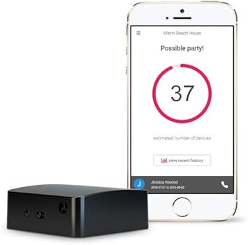 The Party Squasher occupancy monitoring service consists of a small sensor connected to a proprietary cloud service. The sensor passively counts the mobile devices in and around a home, even if they are not connected to Wi-Fi, to report the number of mobile devices at a property. Up-to-the-minute and historical counts are delivered via the Party Squasher mobile app, available on both Google Android and Apple iOS mobile phones.