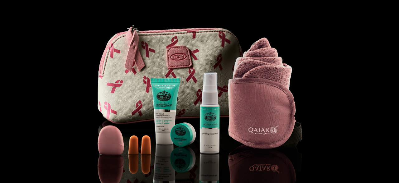 Designed by Qatar Airways in collaboration with the stylish Italian luggage brand – BRIC’S, the limited-edition amenity kits are made from vegan leather and are offered in two different designs – a pink and white kit for female passengers, and a black kit for male passengers, both with the iconic breast cancer ribbon prints. Each kit includes products from Italy’s Castello Monte Vibiano Vecchio, the environmentally friendly olive oil company, including lip balm, hydrating facial mist, and anti-ageing moisturiser in special limited edition ‘pink’ branding.