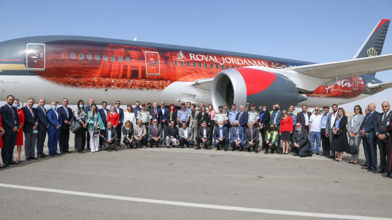 In a move aimed at projecting Jordan to the world as an attractive tourist destination, Royal Jordanian, the Kingdom’s national carrier, has placed Petra-inspired livery on one of its wide-bodied 787 aircraft, an event that brought together HRH Dana Firas the President of Petra National Trust and UNESCO Goodwill Ambassador for Cultural Heritage, RJ Chairman of the Board Said Darwazeh, RJ Vice Chairman/CEO Samer Majali, Jordan Tourism Board members, all concerned authorities operating at QAIA, a number of social media influencers and RJ officials.