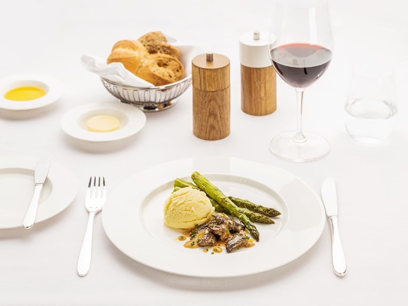 SWISS’s Business Class customers, too, can look forward to carefully created delights. For his first course here, Rabe offers a salmon trout terrine with yoghurt mousse and pumpernickel. His main course is a choice of sautéed beef fillet with wild garlic demi-glace or poached chicken breast with tomato and mushroom ragout sauce. And for dessert he has concocted a chocolate and spelt panna cotta with millet and apple crumble.