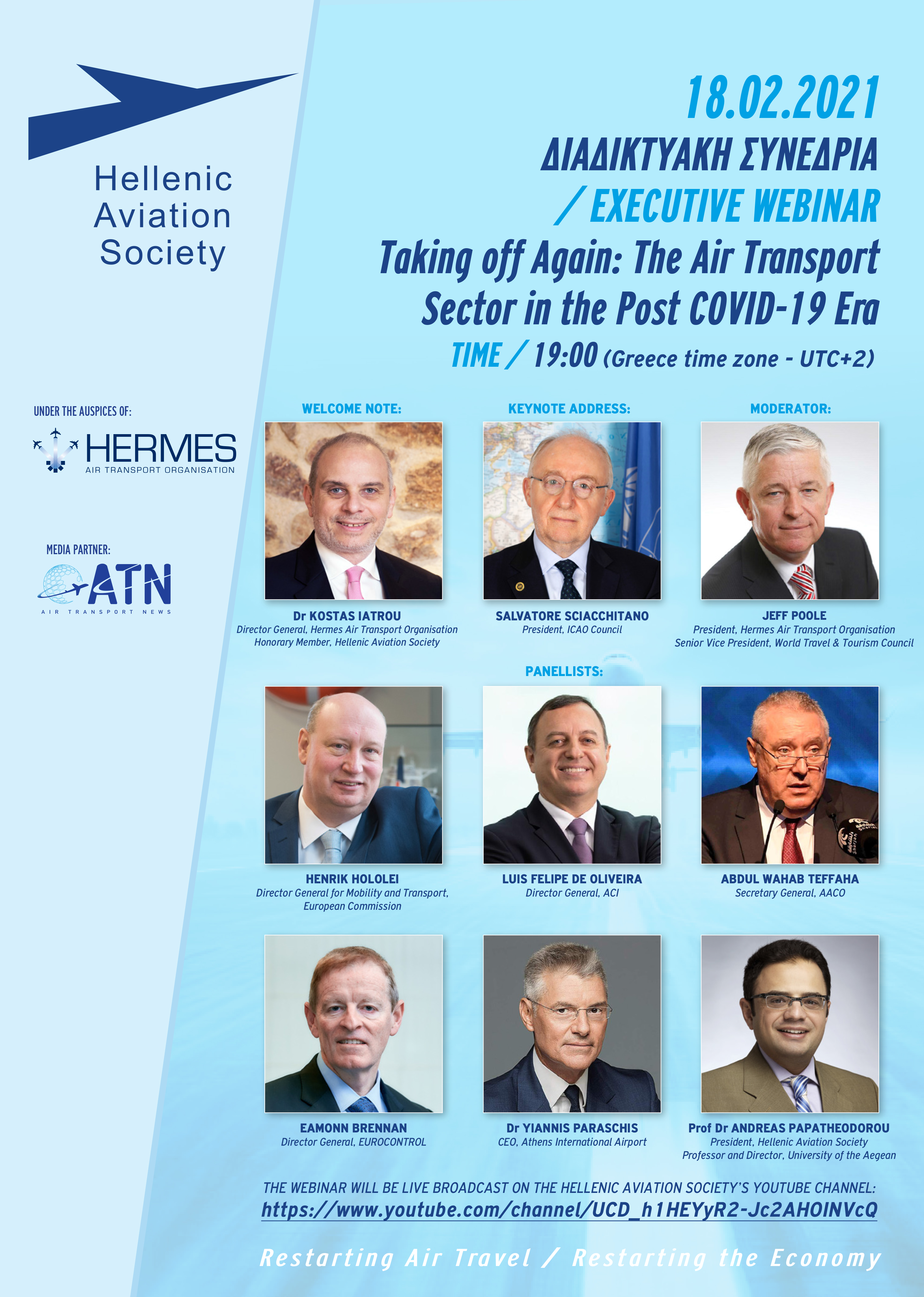 Having the above in mind and in line with its mission statement, the Hellenic Aviation Society organizes an executive webinar with very distinguished speakers on the future of the air transport sector in the post COVID-19 era next Thursday 18th of February at 19:00 Greece. time (UTC+2). His Excellency the President of the ICAO Council Mr Salvatore Sciacchitano will open the webinar with a keynote speech and be subsequently presented with the prestigious Keramianakis Award. The webinar will be live broadcast on the Society's YouTube Channel: https://www.youtube.com/channel/UCD_h1HEYyR2-Jc2AH0INVcQ