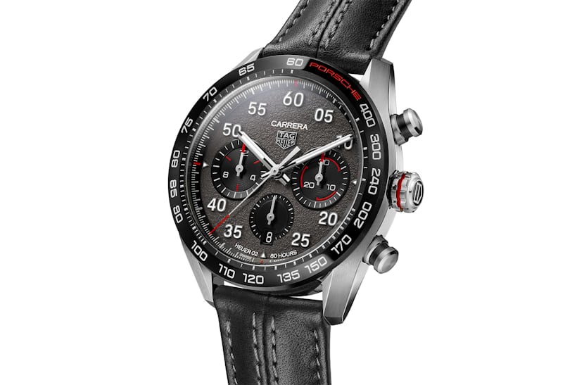 The design is a perfectly balanced alliance of the essence of each brand’s identity. The Porsche colors of red, black and gray and unmistakable font are joined by Arabic numerals that evoke the numbers on the dashboard of exquisite Porsche sportscars. The asphalt effect of the black dial, embodying a passion for the road, was designed specially for this limited edition watch. For lovers of speed and precision, the timepiece is powered by the in-house Calibre Heuer 02 manufacture movement with a reserve of 80 hours.
