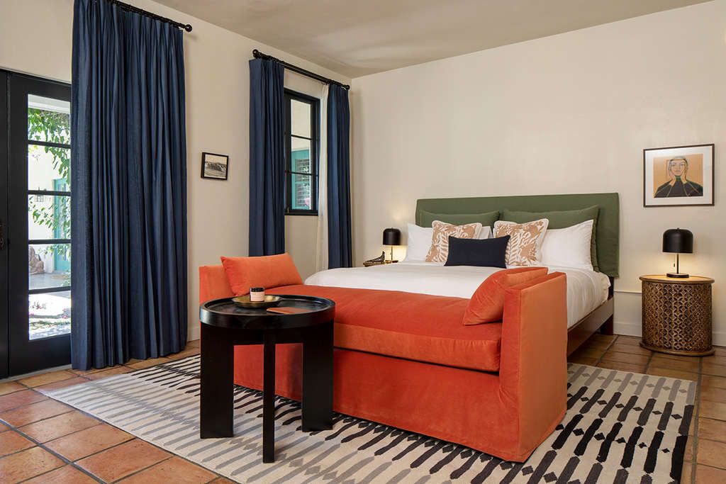 “With warm coral velvet, textured blue-green accents and otomi-patterned pillows, the rooms are imbued with depth to enliven the existing plaster interior,” said Cayley Lambur and Lucia Bartholomew, Electric Bowery’s founders, designers, and architects. “Each room features richly colored zellige tile and deep blue millwork in the bathrooms and bar areas, reflecting the Mediterranean influence in a modern design. We custom designed upholstered elements and cabinetry in the space for an inviting, residential feel. The dark wood tones balance the rich pops of color, creating a classic yet modern aesthetic that is unlike any other in Palm Springs.”