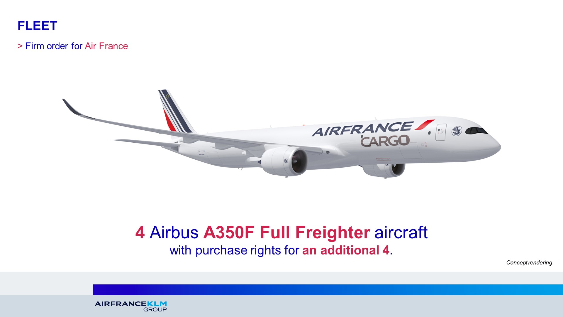 Air France-KLM announces its decision to convert into a firm order the Letter of Intent it signed in December 2021 for the acquisition of 4 Airbus A350F full freighter aircraft – with purchase rights for an additional 4 aircraft.