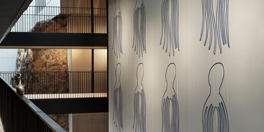 Κατά την είσοδο στον χώρο υποδοχής, οι επισκέπτες καλωσορίζονται με ένα πρωτότυπο γλυπτό που αναπαριστά ένα υβρίδιο της Σφίγγας και του Μινώταυρου που παραπέμπουν στην αρχαία ιστορία του νησιού. Ένα πρωτότυπο έργο που αντανακλά κλαδιά και πνεύμονες απλώνεται κάθετα πίσω από τη ρεσεψιόν, συμβολίζοντας τη ζωή και τη ζωτικότητα. Χάλκινα πλάσματα κοσμούν κομψά τους διαδρόμους, που ανακαλύπτουν οι επισκέπτες καθώς κατευθύνονται προς τα δωμάτιά τους.