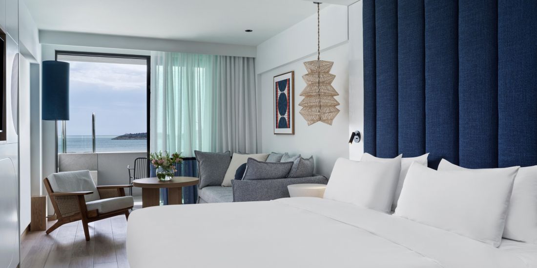 Καθένα από τα 199 δωμάτια και σουίτες του θέρετρου προκαλεί μια αίσθηση γαλήνης και κομψότητας μέσω των εσωτερικών χώρων που συνδυάζουν σύγχρονα λευκά είδη και έπιπλα με στοιχεία εμπνευσμένα από βιολογικά προϊόντα και παραδοσιακές κρητικές επιρροές. Ο μινιμαλιστικός σχεδιασμός κυριαρχεί στα δωμάτια Classic και Premium, τα οποία διαθέτουν ιδιωτικές πισίνες, μπαλκόνια, παροχές για καφέ, καμπίνα ντους και πολυτελή προϊόντα περιποίησης. Οι επισκέπτες μπορούν να επιλέξουν από μια σειρά από ευρύχωρες σουίτες με κρεβάτια super king size, επιπλωμένα μπαλκόνια με εκπληκτική θέα στη θάλασσα, καμπίνα ντους και άνετους καναπέδες-κρεβάτια.