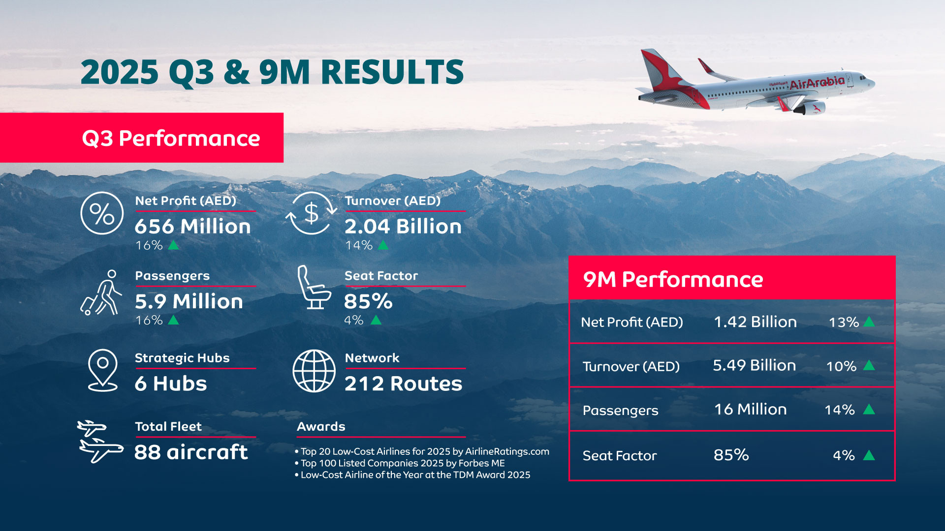 During the first nine-month 2025, Air Arabia expanded its network by launching 12 new routes across its operating hubs in the UAE, Morocco, Egypt, and Pakistan, bringing the total network size to 212 routes. During the same period, Air Arabia added 6 aircraft to its modern fleet bringing it to a total of 88 owned and leased Airbus A320 and A321 aircraft, with more aircraft scheduled to join the fleet before end of 2025.