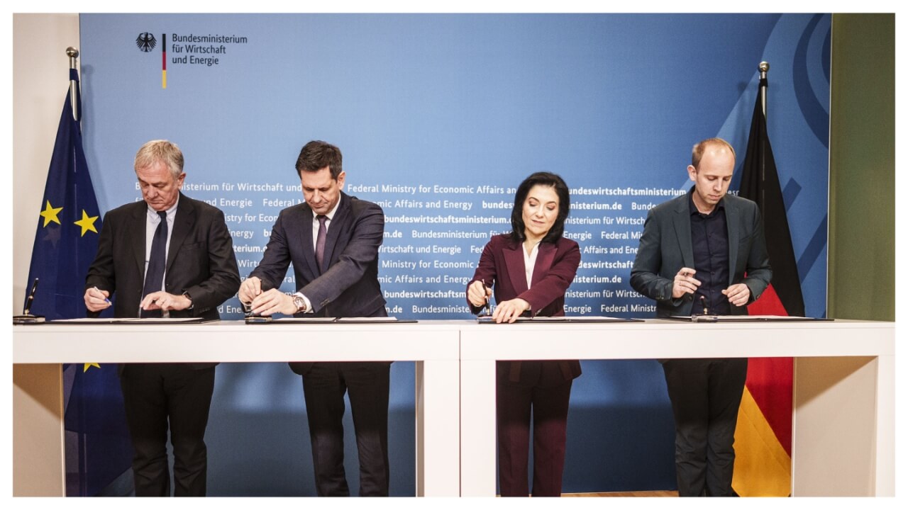 At a signing ceremony, from left, are MSC Cruises' Pierfrancesco Vago, Minister President Olaf Lies, Federal Minister Federal Minister Katherina Reiche and Parliamentary State Secretary Dennis Rohde PHOTO: ©PHOTOTEK/DOMINIK BUTZMANN